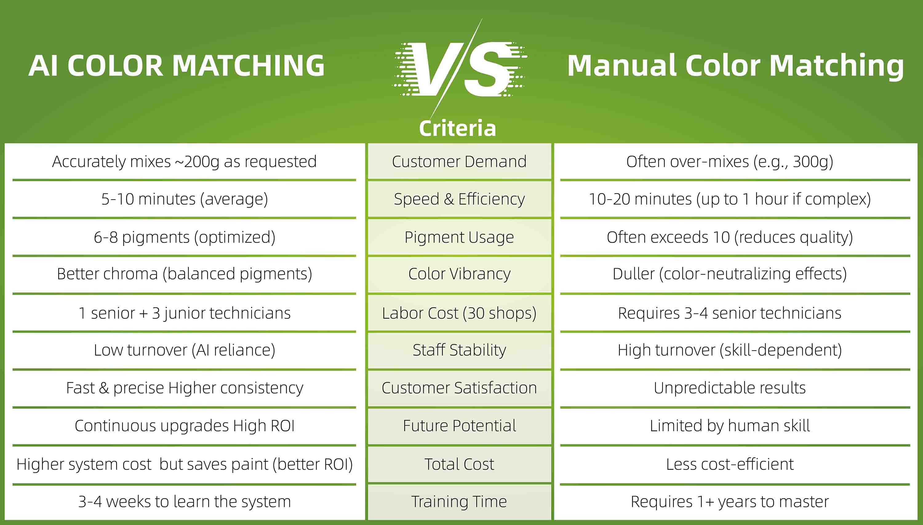 データから明らかなのは、AIによるカラーマッチングが、スピード、精度、顔料効率、労働力の安定性、そして長期的なROIにおいて目に見える改善をもたらすということです。特に高度なカスタマイズや芸術的な用途においては、手作業によるカラーマッチングも依然として有効ですが、拡張性、信頼性、そして費用対効果の高いオペレーションを求める現代のボディショップにとって、AIは急速により賢明な選択肢になりつつあります。